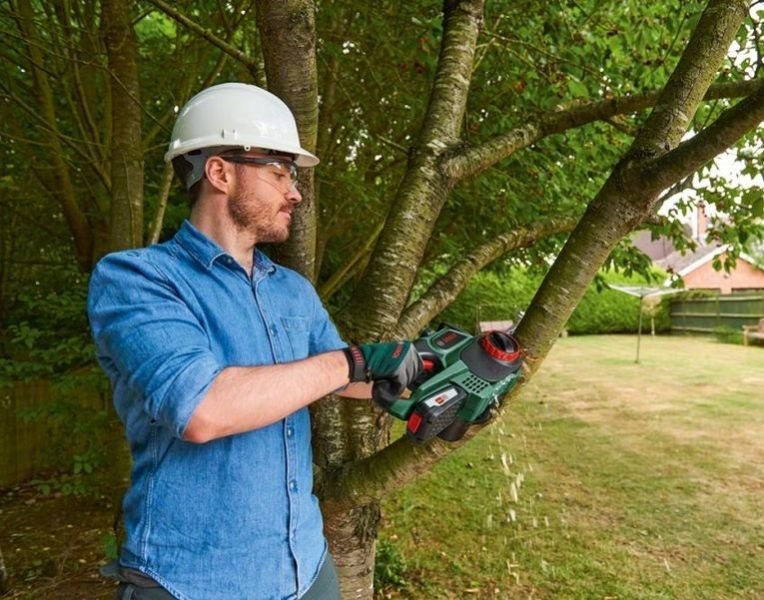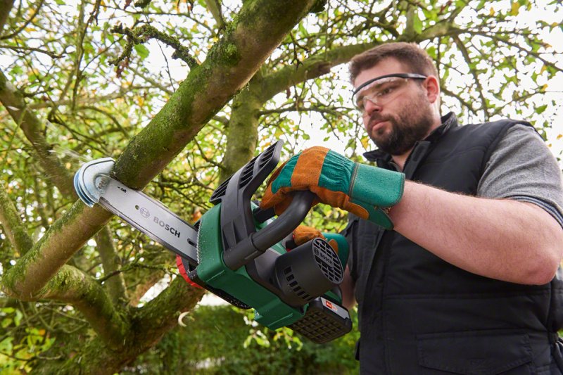 Високопродуктивна ланцюгова пилка Bosch UniversalChain 18, що працює на Li-Ion 18 В акумуляторі, забезпечує абсолютну свободу від електрики та мережевих кабелів під час розпилювання гілок, дров, колод, дощок, стовбурів дерев. Шина довжиною 20 см зі сталевим ланцюгом 3/8ʺ-90 PX, з товщиною привідних ланок 1,1 мм робить зріз 13,5 см. Пила зі швидкістю ланцюга 4,5 м/с однаково ефективно ріже деревину вздовж і поперек волокон. Безінструментальна SDS система встановлення та регулювання натягу ланцюга. Автоматичне змащування ланцюга. Постачається в комплекті з акумулятором, зарядним пристроєм.