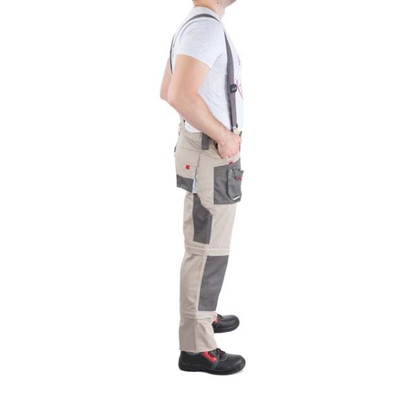 Багатофункціональні брюки бежевого кольору мають унікальну конструкцію, завдяки чому можуть трансформуватися в напівкомбінезон, брюки, бриджі, шорти з лямками і без них. Така універсальність моделі дозволяє носити їх як влітку, так і в інші сезони.