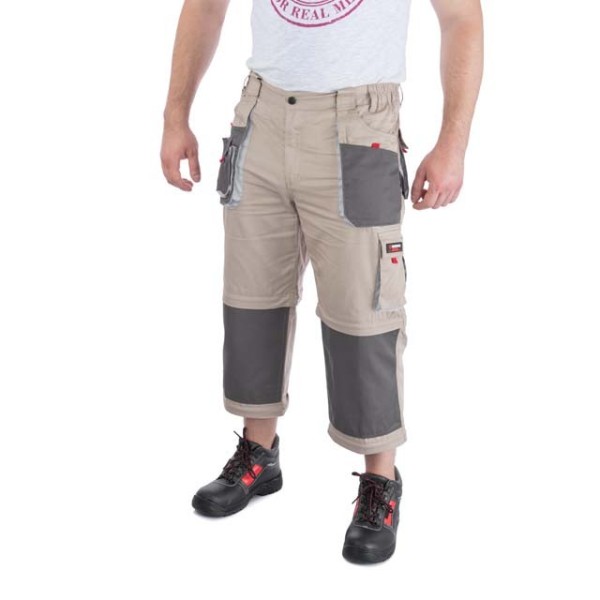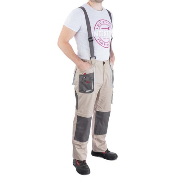 Багатофункціональні брюки бежевого кольору мають унікальну конструкцію, завдяки чому можуть трансформуватися в напівкомбінезон, брюки, бриджі, шорти з лямками і без них. Така універсальність моделі дозволяє носити їх як влітку, так і в інші сезони.