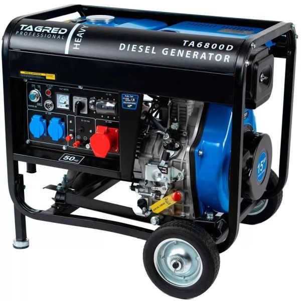 Дизельний генератор TAGRED TA6800D - це універсальне джерело живлення однофазних і трифазних приладів, яке генерує 2 типи вихідної напруги - 230 В і 400 В. Номінальна потужність при 230 В становить 4,6 кВт, при 400 В - 6,3 кВт. Оснащений витривалим двигуном потужністю 15 к.с. з повітряним охолодженням і запуском від електростартера. Опційно можна замовити блок АВР для автоматичного запуску.