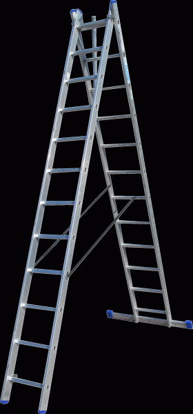 За рахунок розтяжок, драбина міцно стоїть як стремянка, а також запобігає випадковому складанню. Можна відрегулювати кут драбини, це дуже зручно в невеликому приміщенні. На одній з секцій, внизу велика 76 см поперечна планка, за рахунок якої збільшується площа упору. Діапазон висот – 6-20 сходинок (2,4-9,2м). Протиковзні полімерні упори, рельєфні сходинки, з наскрізним монтажем в опори драбини збільшують її надійність та стійкість.