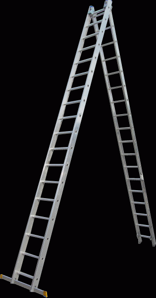 За рахунок розтяжок, драбина міцно стоїть як стремянка, а також запобігає випадковому складанню. Можна відрегулювати кут драбини, це дуже зручно в невеликому приміщенні. На одній з секцій, внизу велика 76 см поперечна планка, за рахунок якої збільшується площа упору. Діапазон висот – 6-20 сходинок (2,4-9,2м). Протиковзні полімерні упори, рельєфні сходинки, з наскрізним монтажем в опори драбини збільшують її надійність та стійкість.
