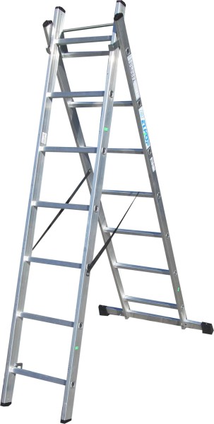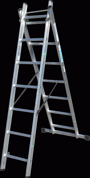 За рахунок розтяжок, драбина міцно стоїть як стремянка, а також запобігає випадковому складанню. Можна відрегулювати кут драбини, це дуже зручно в невеликому приміщенні. На одній з секцій, внизу велика 76 см поперечна планка, за рахунок якої збільшується площа упору. Діапазон висот – 6-20 сходинок (2,4-9,2м). Протиковзні полімерні упори, рельєфні сходинки, з наскрізним монтажем в опори драбини збільшують її надійність та стійкість.