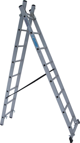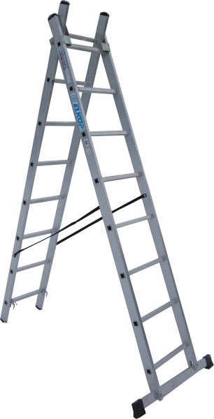За рахунок розтяжок, драбина міцно стоїть як стремянка, а також запобігає випадковому складанню. Можна відрегулювати кут драбини, це дуже зручно в невеликому приміщенні. На одній з секцій, внизу велика 76 см поперечна планка, за рахунок якої збільшується площа упору. Діапазон висот – 6-20 сходинок (2,4-9,2м). Протиковзні полімерні упори, рельєфні сходинки, з наскрізним монтажем в опори драбини збільшують її надійність та стійкість.