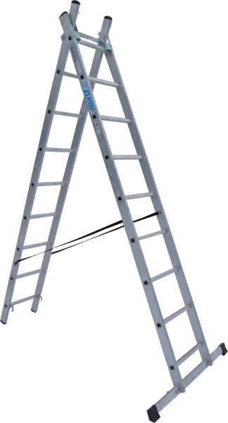 За рахунок розтяжок, драбина міцно стоїть як стремянка, а також запобігає випадковому складанню. Можна відрегулювати кут драбини, це дуже зручно в невеликому приміщенні. На одній з секцій, внизу велика 76 см поперечна планка, за рахунок якої збільшується площа упору. Діапазон висот – 6-20 сходинок (2,4-9,2м). Протиковзні полімерні упори, рельєфні сходинки, з наскрізним монтажем в опори драбини збільшують її надійність та стійкість.