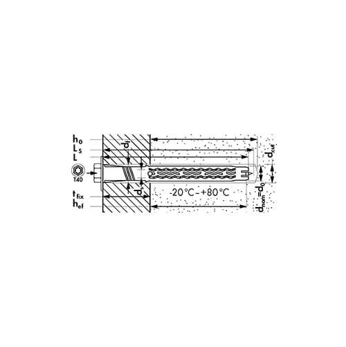 Діаметр анкера та бура d(nom)=d(0) 10 мм.; Довжина L 100 мм.; Корисна довжина t(fix) 30 мм.; Мін. глибина установки h(ef) 70 мм.; Діаметр стопорного гвинта d(s) 7 мм.; Довжина стопорного гвинта L(s) 105 мм.; Глибина отвору h(0) 80 мм.; Розмір під ключ SW 13; Розмір під біту Т40