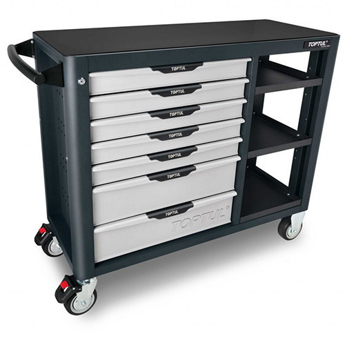 Візок для інструменту TOPTUL TCBH0703 7 секцій + 3 відкриті полиці металевий 746х462х805 мм. Оснащений 5-ма ящиками 578х378х75 2-ма ящиками 578х378х155, серія Pro-Plus здатна витримувати навантаження до 680 кгПереваги Pro-Plus серії: