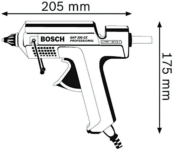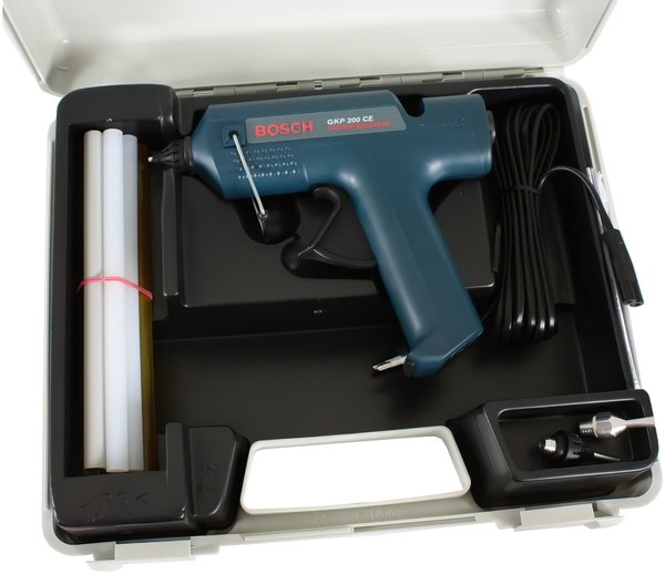 За 80 років застосування клейових пістолетів чіткого їх поділу на побутові і професійні так і не відбулося. Проте, дана модель все ж гідна називатися професійної по безлічі ознак. Перш за все, саме призначення пістолета. Монтаж дерев'яних конструкцій, фанерних щитів, наклеює лінолеум, ремонт деталей з пластмаси - все це можна виконувати за допомогою цього пристрою. А перерахувати абсолютно всі області застосування - нереально. Швидкий розігрів (всього 4 хв) здійснюється двома нагрівальними елементами, керованими електронікою. Таке конструктивне рішення - застосування додаткової потужності для розігріву клейової маси - теж притаманне постійно затребуваним інструментам. Можливість використання знімного мережевого шнура свідчить про те, що ця сама електроніка ще довго підтримує в термокамері необхідну температуру без подачі живлення. Дотримання необхідного температурного режиму сприяє і термозахисний корпус, який до того ж надійно захищає користувача від опіків. Швидкість подачі клею становить 30 г/хв. Такий показник теж характерний для професійних Термопістолет. Наявність в комплекті змінних насадок різних форм розширює його функціональні можливості і підтверджує, що область застосування пістолета не обмежується якимось одним видом робіт. Передбачено використання циліндричних стрижнів діаметром в 11 мм і довжиною в 200 мм. Подача патрона здійснюється курковим механізмом карусельного типу. Сопло має ніпельний вузол, що перешкоджає довільному витікання розплавленого клею. Оснащений ергономічною ручкою, легкий, клейовий пістолет Bosch GKP 200 CE дійсно є інструментом професіоналів.