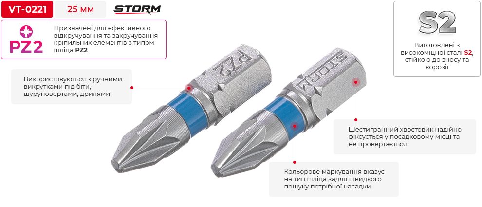 Біти маркуються синім кольором, який вказує на тип шліца - PZ. Це дозволить вам швидко знайти необхідну насадку серед інших біт у вашому арсеналі інструменту.
