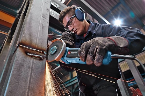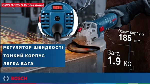 Кутошліфувальна машина Bosch GWS 9-125 S Professional - легкий (1,9 кг), невеликий (280х73 мм) електроінструмент, що працює з дисками 125 мм, з унікальною зачищаючою і ріжучою здатністю. Потужність 900 Вт. Попередня установка швидкості (регулювання оборотів 2800-11000 об / хв) дає можливість працювати з багатьма матеріалами.