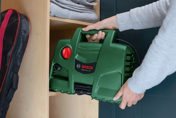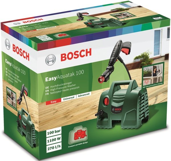 Міні-мийка Bosch EasyAquatak 100 побутового призначення допоможе змити пил з вікон, забруднення з садових меблів, інвентарю, бруд з доріжок, терас, велосипеда. Легкий (3 кг), компактний апарат дозволяє звертатися однією рукою, даючи можливість звільнити другу руку. Забезпечує зручну, легку очистку самих важкодоступних місць.
