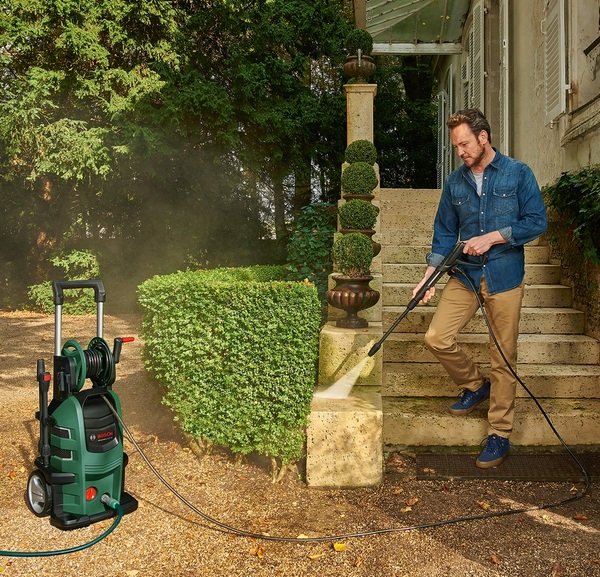 Мийка високого тиску Bosch - вирізняється простотою і зручністю використання. Корпус обладнаний складною ручкою і збільшеними колесами, що значно полегшує транспортування і зберігання пристрою. Також конструкція апарату передбачає котушку для намотування шланга.