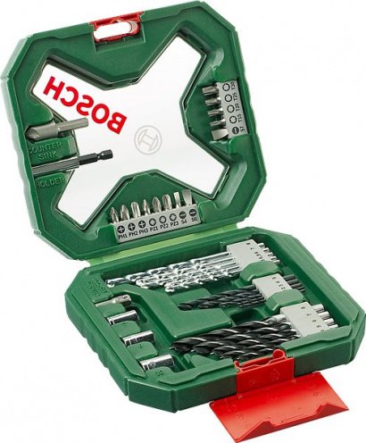 Для домашньої майстерні хорошим придбанням стане набір свердел і насадок-біт Bosch 2607010608, який поставляється у валізі. Цей набір складається з 34 предмета найпопулярніших аксесуарів, які легко справляються з викручуванням і закручуванням болтів, саморізів, гайок, а також зі свердлінням в різних матеріалах отворів. Особливість комплекту в можливості застосування спільно з електричним інструментом. Наявність компактного контейнера, в якому зручно розмістилися всі інструменти, вирішує проблему зберігання і транспортування.