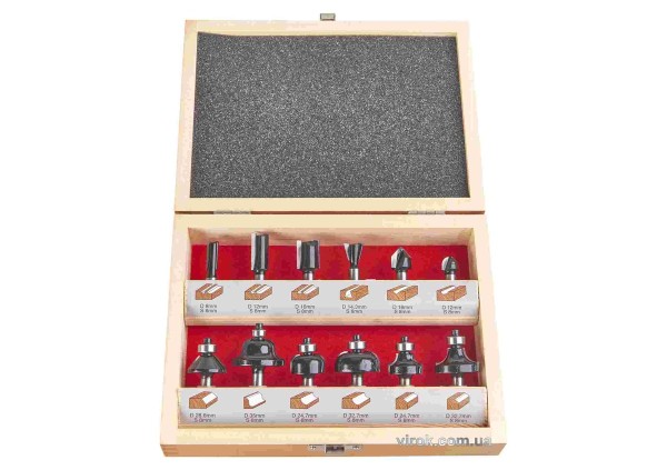Набір фрез AEG зі шпінделем Ø= 8 мм, в деревяному футлярі, 12 шт