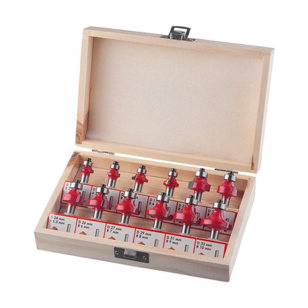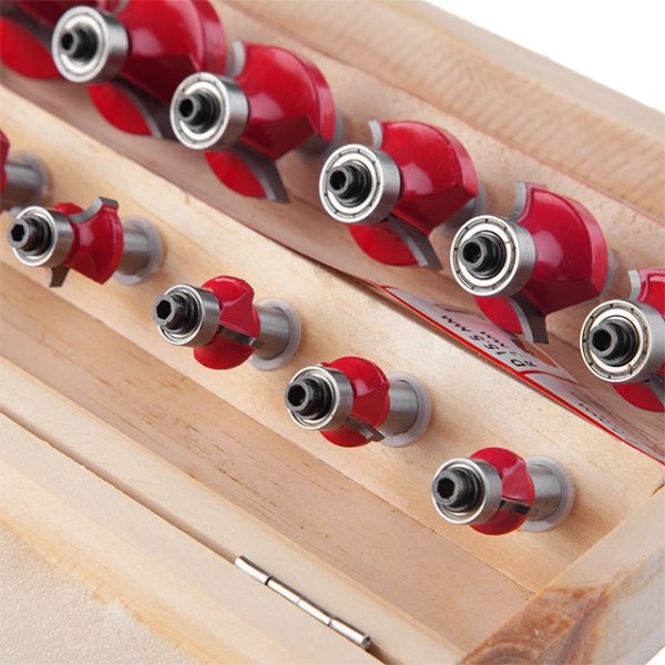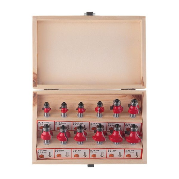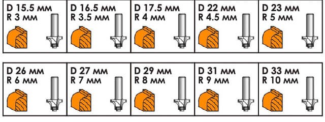 У наборі 12 фрез різного діаметра: 15,5, 16,5, 17,5, 22, 23, 26, 27, 29, 31, 33 мм. Наявність підшипника на кожній фрезі дозволяє обробляти профіль заготовки без застосування додаткового обладнання та упору фрезерного верстата на опорну напрямну. Завдяки таким калювальним фрезам, надається багата та складна форма краю заготовки, завдяки цьому виготовляють фігурні ніжки столів, стільців, шаф, інших меблів та декоративних виробів.