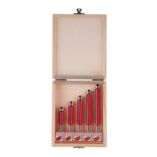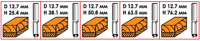 В наборі 5 фрез однакового діаметра, різної довжини: 25.4; 38.1; 50.8; 63.5; 76.2 мм. За рахунок того, що встановлена у фрезер фреза утворює з поверхнею опорного стола кут 90° , це дозволяє обробляти край заготовки строго перпендикулярно.