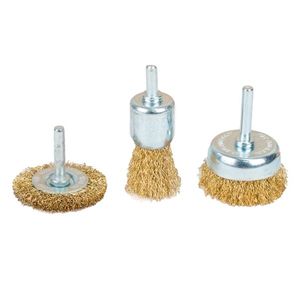 Набір щіток дротяних 3шт Ø25; 50; 50мм хвостовик Ø6мм (латуньована) SIGMA (9010011) призначений для зачистки поверхонь від лакофарбових покриттів, іржі, окалини, різних забруднень, зачистки зварних швів.