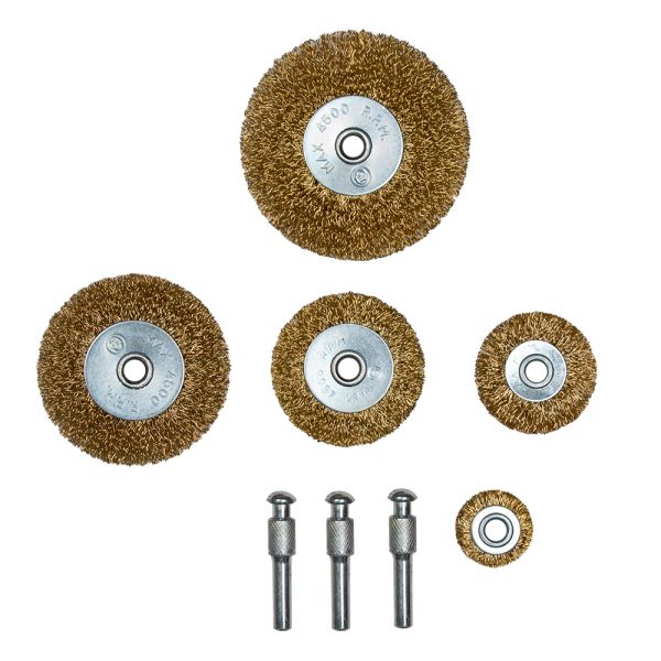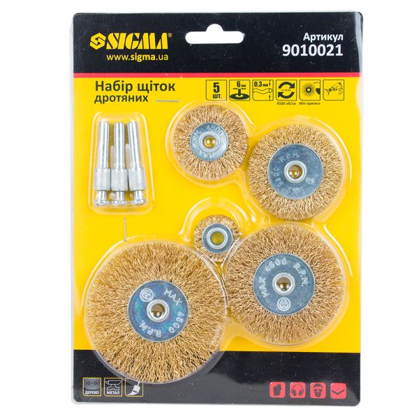 Набір щіток дротяних 5шт Ø25; 38; 50; 65; 75мм хвостовик Ø6мм (латунірованная) SIGMA (9010021) призначений для зачистки поверхонь від лакофарбових покриттів, іржі, окалини, різних забруднень, зачистки зварних швів.