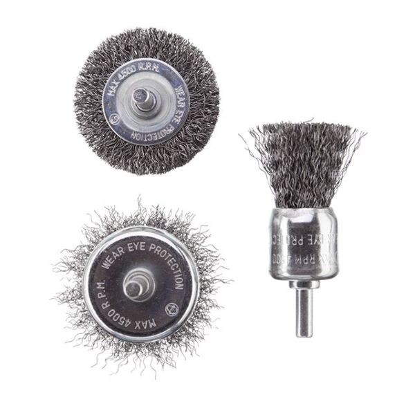 Призначення Набір складається з трьох щіток, спеціально розроблених для швидкого очищення та шліфування різних поверхонь: металу, цегли, каменю, дерева тощо. Ідеально підходять для використання з дрилями зі швидкістю обертання 4500 об/хв. Такі дротяні щітки забезпечують чудову якість зачищення навіть у важкодоступних місцях. Надійна конструкція Щітки з гофрованого дроту, діаметром 0,3 мм, жорстко закріплені на металевому тримачі, дріт не випадає під час роботи, що гарантує якісне з'єднання. Щітки вирізняються стійкістю, довговічністю та ефективним використанням. Комплектація Біти в головках 1/2": H4, H5, H6, H7, H8, H10, H12, H14, H17.