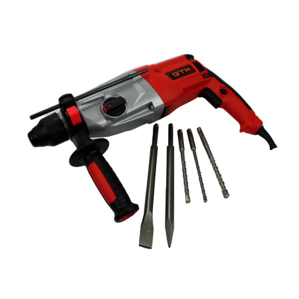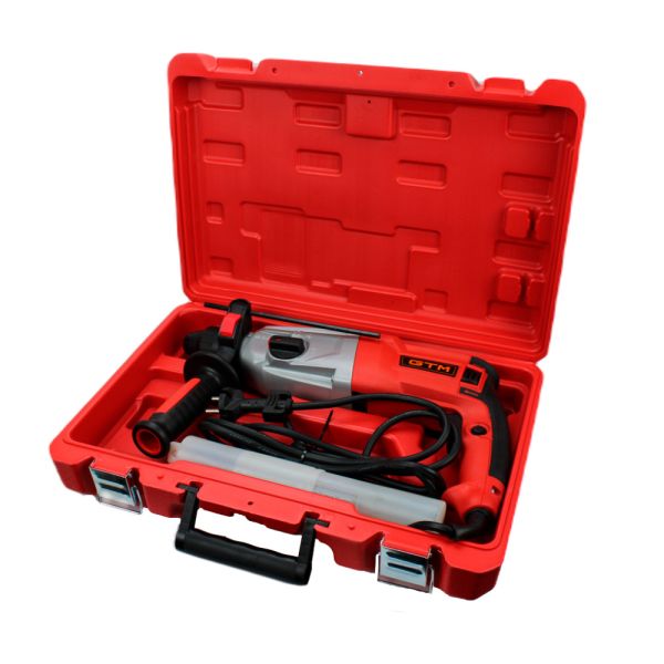 Перфоратор GTM RH28/850EV - напівпрофесійний перфоратор для проведення свердлильних робіт під час ремонту та будівництва В інструмент встановлений продуктивний колекторний двигун потужністю 850 Вт, який живиться від побутової мережі 220 В. У перфораторі є 3 робочі режими: просте свердління, свердління з ударом і довбання. Також для зручності є режим налаштування кута зубила для більш комфортної роботи. Перфоратор поставляється у міцному пластиковому кейсі з набором піків та бурів.