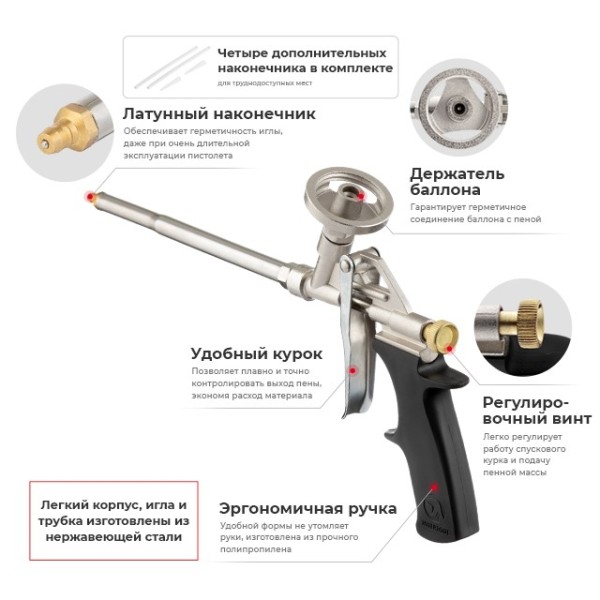 Чотири додаткових наконечника у комплекті забезпечують подачу піни у важкодоступні місця та специфічне застосування пістолета.