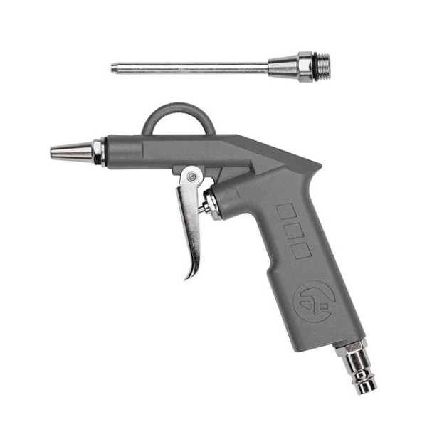 Особливістю даної моделі є наявність подовженого сопла в комплекті, що дозволяє дістати до вузьких, важкодоступних місць, куди не дотягнутися звичайною насадкою. Також можна використовувати стандартне коротке сопло. Усі насадки мають шестигранний профіль перед різьбою для зручного монтажу та демонтажу. Потік повітря легко регулюється важелем та клапаном, які передбачені в конструкції пістолета для продування.