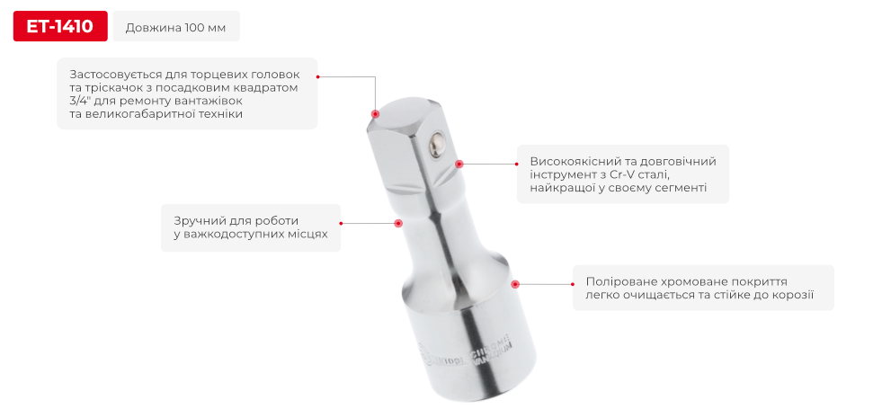 Подовжувач дозволяє працювати з кріпленнями, що знаходяться у важкодоступних місцях або в поглибленнях, куди звичайна головка з тріскачкою не можуть дістати. Довжина подовжувача становить 100 мм.