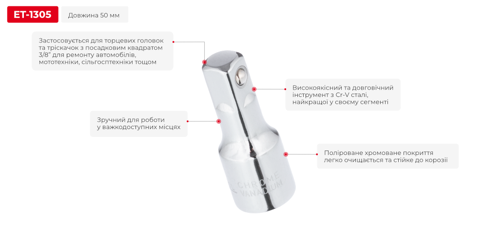 Подовжувач дозволяє працювати з кріпленнями, що знаходяться у важкодоступних місцях або в поглибленнях, куди звичайна головка з тріскачкою не можуть дістати. Довжина подовжувача становить 50 мм.