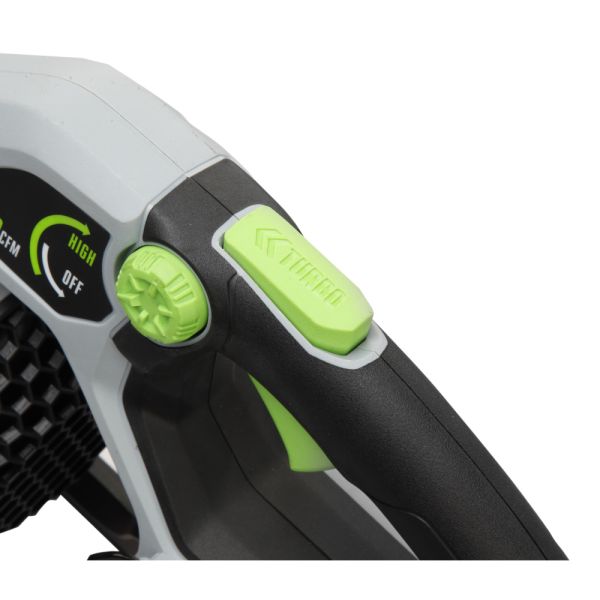 Садовий повітродув EGO LB5800E - потужний та надійний інструмент, який дозволяє швидко та зручно прибрати листя на великих майданчиках. Високу потужність та продуктивність забезпечує безщітковий двигун, який живиться від Li-ion акумуляторів EGO 56V. Завдяки особливій формі турбіни, повітродув здатний видати до 986 куб.м повітря за годину на швидкості до 270 км/год. Швидкість потоку можна плавно регулювати, для максимальної продуктивності на корпусі є окрема кнопка BOOST. Час роботи повітродуву залежить від підключеного акумулятора та вибраного режиму роботи.