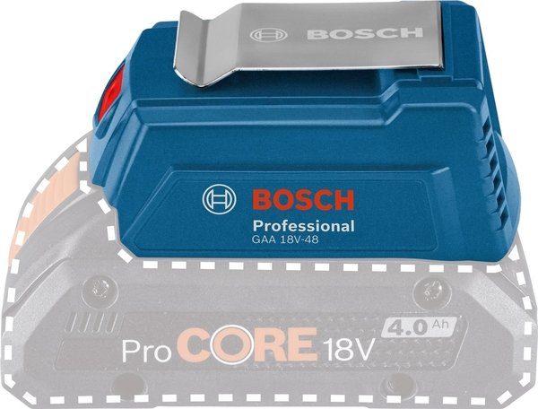 Адаптер ідеально підходить для заряджання пристроїв із живленням від USB і живлення робочого одягу Bosch із підігрівом. Він сумісний з усіма акумуляторами системи Bosch Professional 18V. Також сумісний з AMPShare, мультибрендовим альянсом акумуляторів.