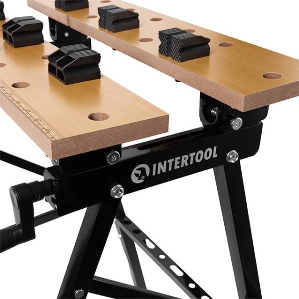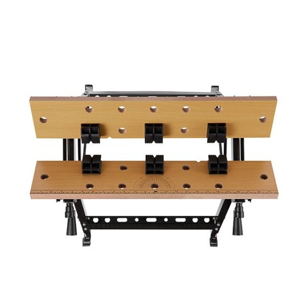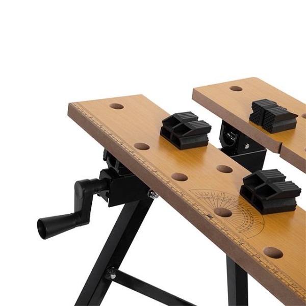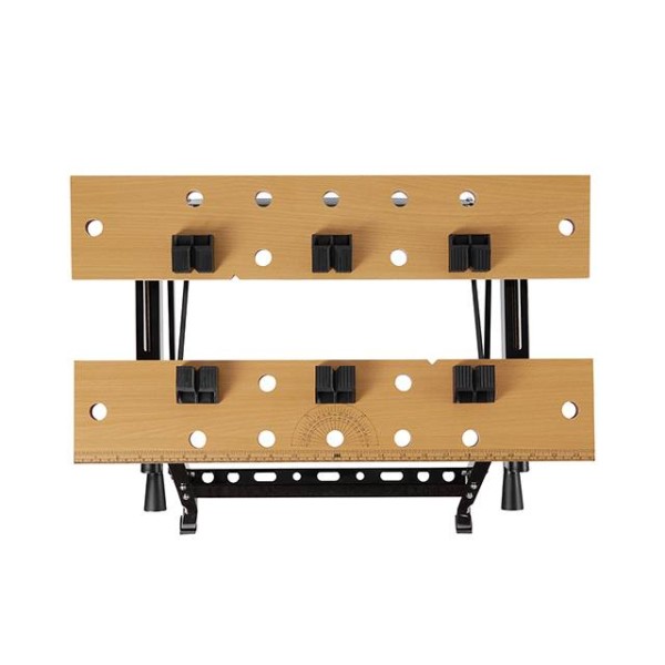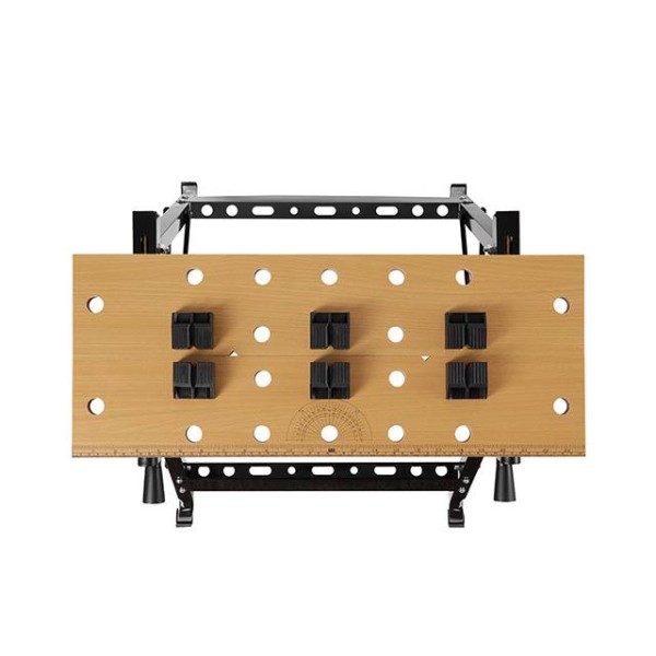 Отвори у стільниці, а також знімні пластикові упори служать для стискання та фіксації заготовок. Додатково верстак оснащений лінійкою та транспортиром для точних вимірювань у процесі роботи.