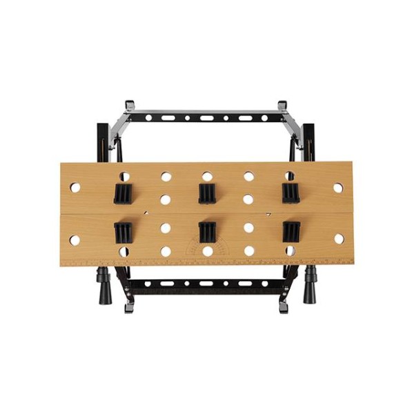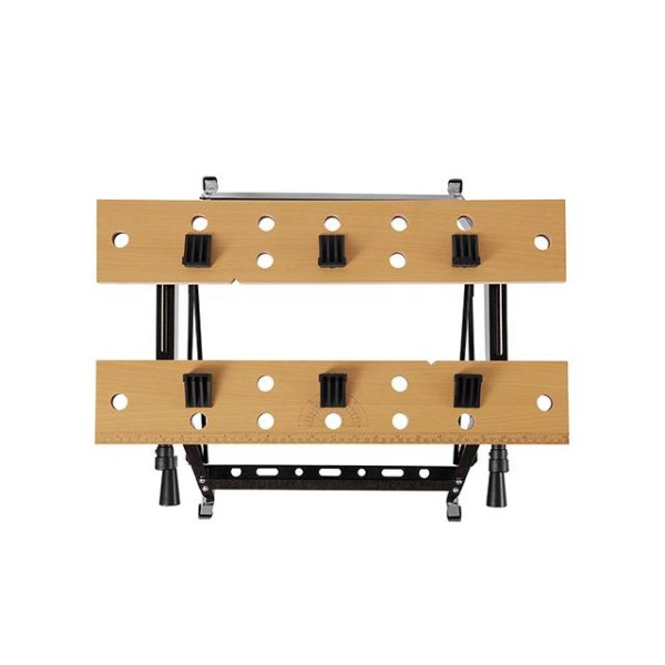 Отвори в стільниці, а також знімні пластикові упори, служать для стискання та фіксації заготовок. Додатково верстак оснащений лінійкою та транспортиром для точних вимірювань у процесі роботи.