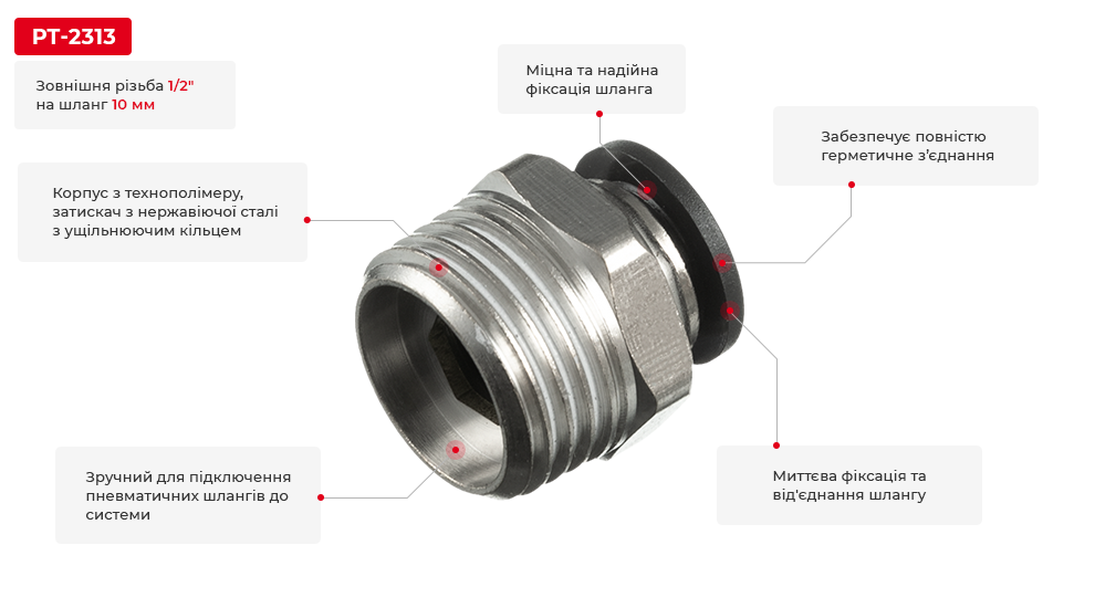 Простий і швидкий принцип роботи цангового затискача дозволяє однією рукою приєднувати шланги. Для цього необхідно всього лише вставити шланг у фітинг з невеликим зусиллям. Від'єднати його можна просто натиснувши на спеціальну кнопку-кільце навколо шланга у сторону фітинга, при цьому цанга розтиснеться і шланг можна легко вийняти з фітинга.