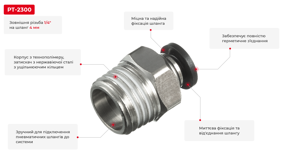 З'єднання цангове для поліуретанових та ін. шлангів 4 мм, 1/4“ зовн. різьба INTERTOOL PT-2300