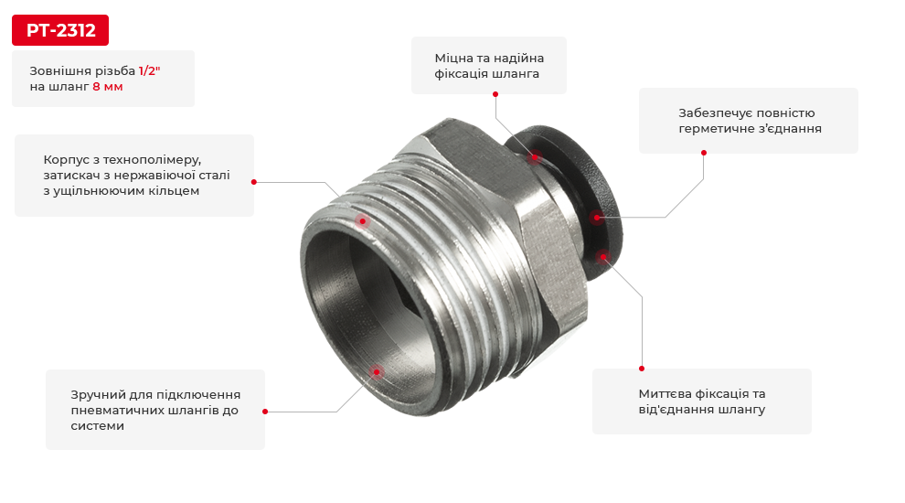 З'єднання цангове для поліуретанових та ін. шлангів 8 мм, 1/2" зовн. різьба INTERTOOL PT-2312